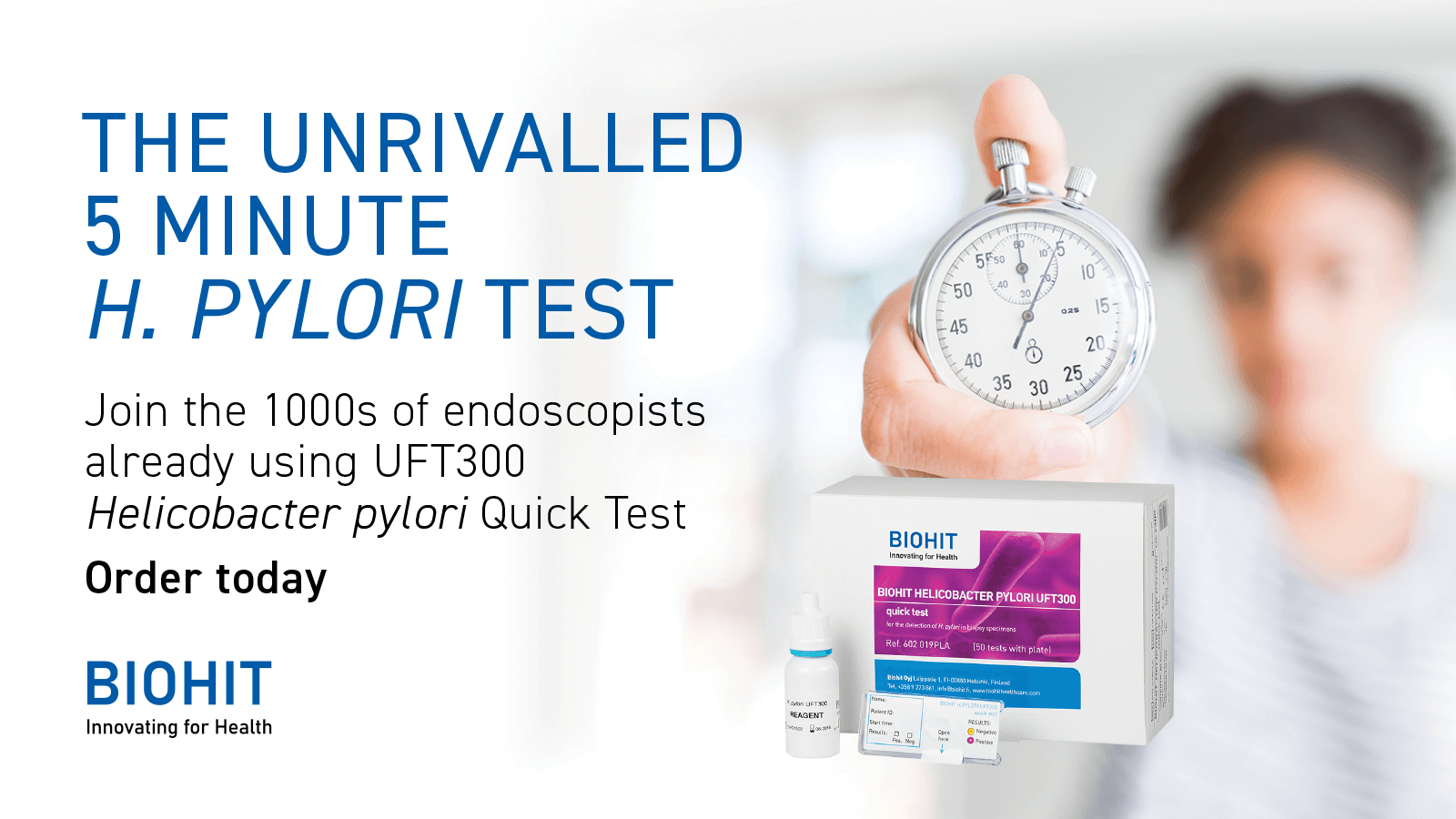 As part of upper endoscopy or gastroscopy procedures, urease tests are routinely used to identify the presence of H. pylori in gastric biopsies. The UFT300 Helicobacter pylori quick test is a rapid urease test that has transformed the diagnostic process and reporting of H. pylori infection in endoscopy settings. Unlike other urease tests, the UFT300 H. pylori quick test takes just 5 minutes, delivering reliable results that can be entered directly into your endoscopy reporting system and discussed with patients before they’ve even left the endoscopy theatre.